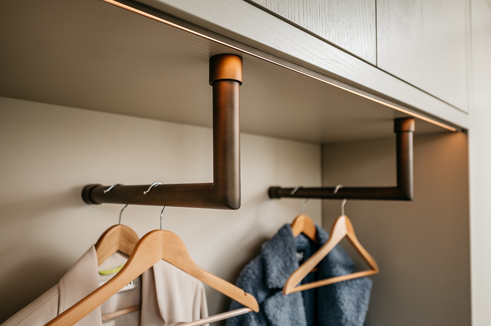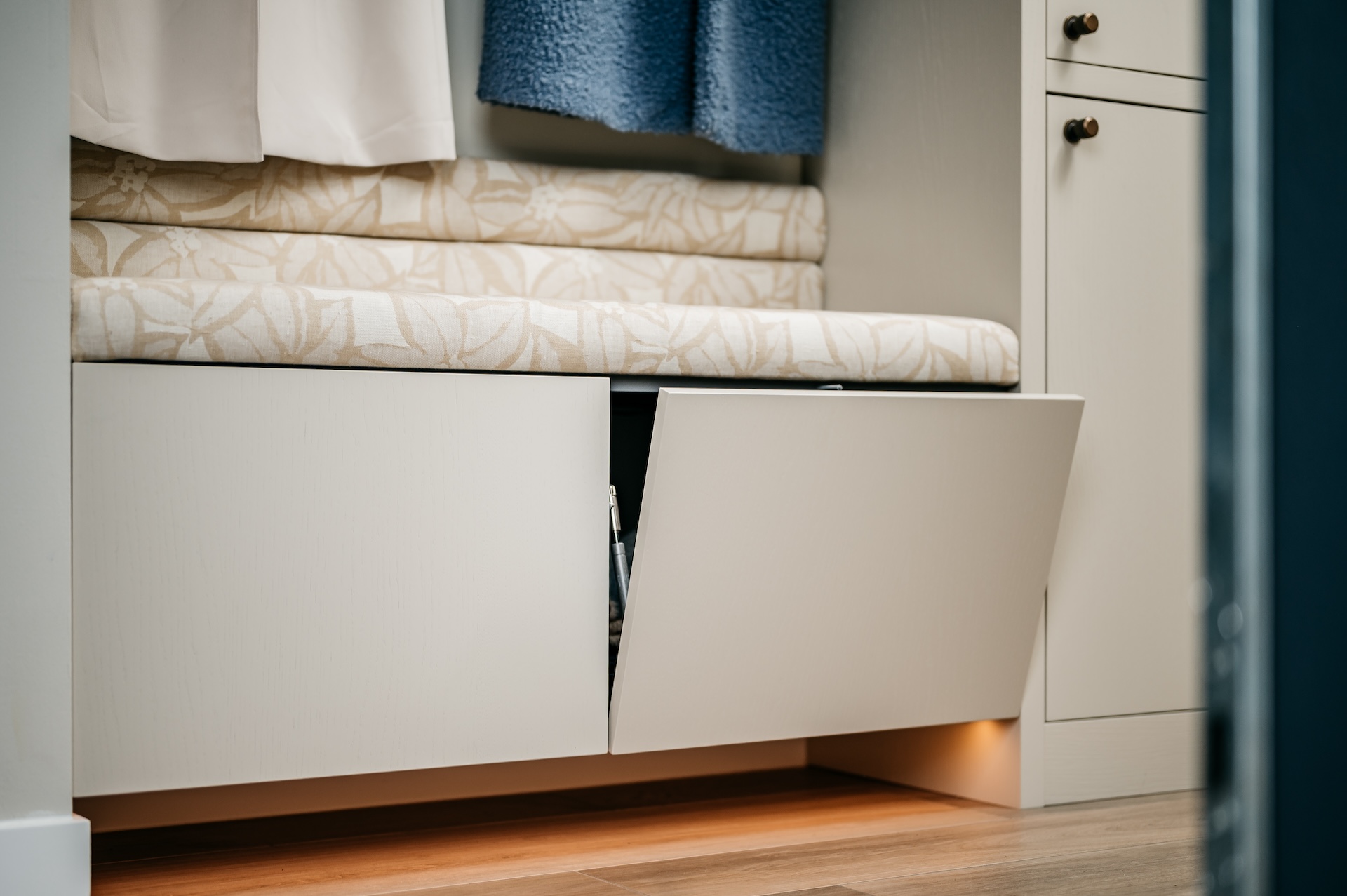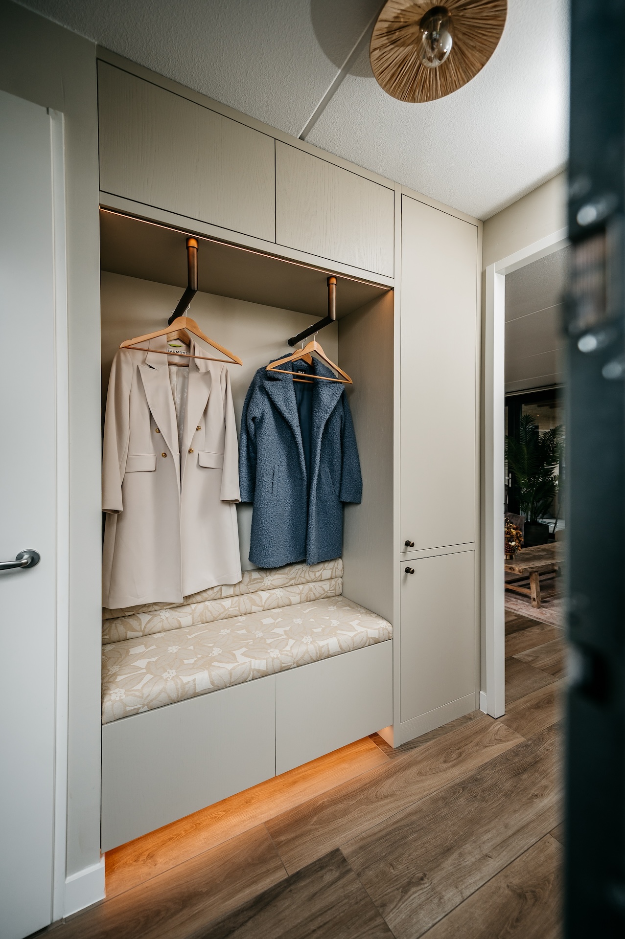 In deze woning realiseerde Tornebold Interieurs zowel een stijlvolle kast in de keuken als een op maat gemaakte garderobekast. Dezelfde zachte kleurstelling en verfijnde details zorgen voor een fijn geheel. Van praktische bergruimte tot een zithoekje voor het aantrekken van de schoenen: alles is tot in detail afgestemd op het interieur en de wensen van de bewoners.