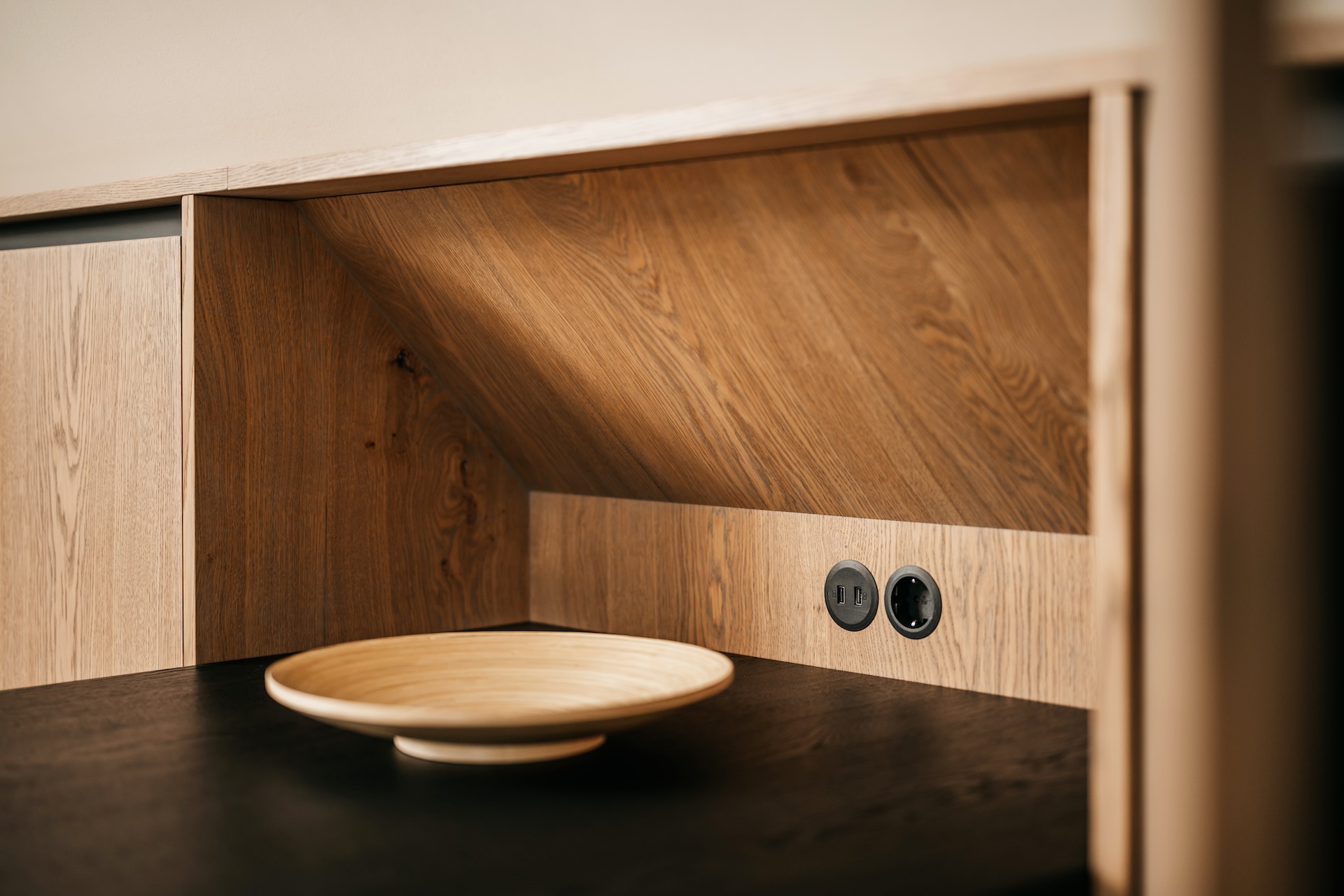 Deze maatwerk kastenwand vormt een stijlvol geheel met het interieur eromheen. Het doordachte ontwerp van eikenhout brengt warmte, terwijl de strakke belijning rust uitstraalt.