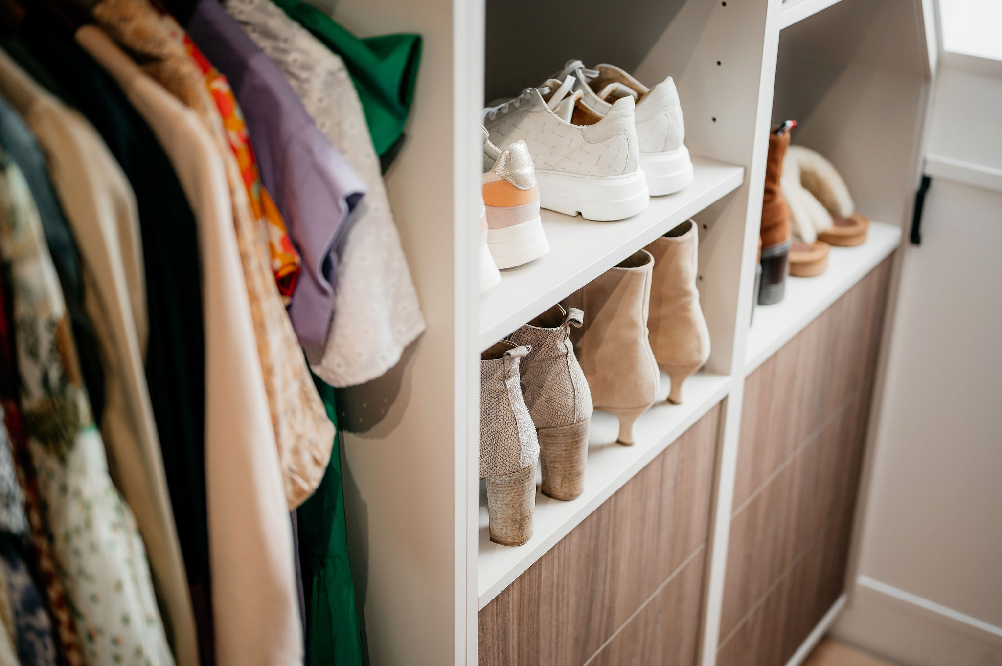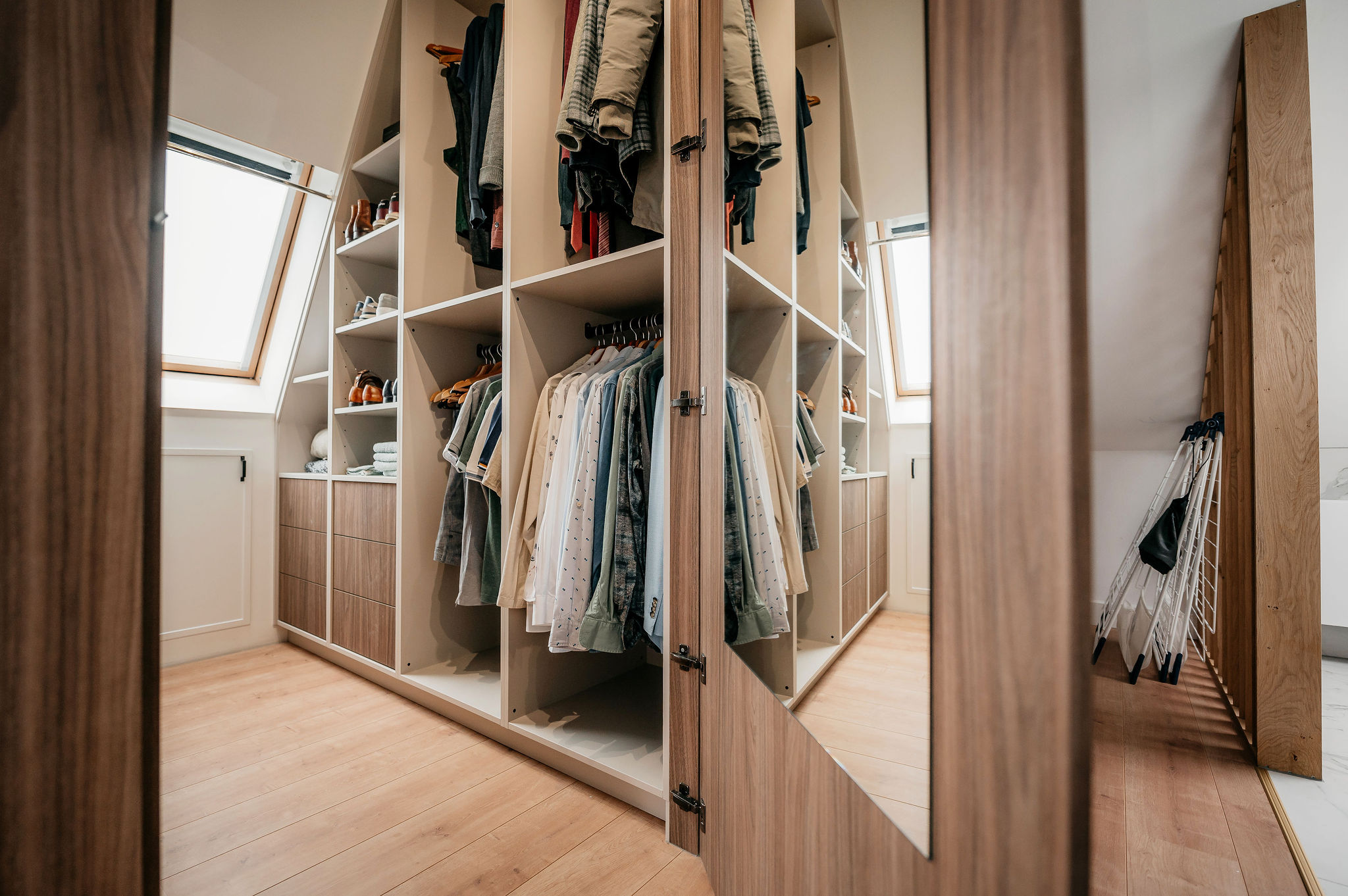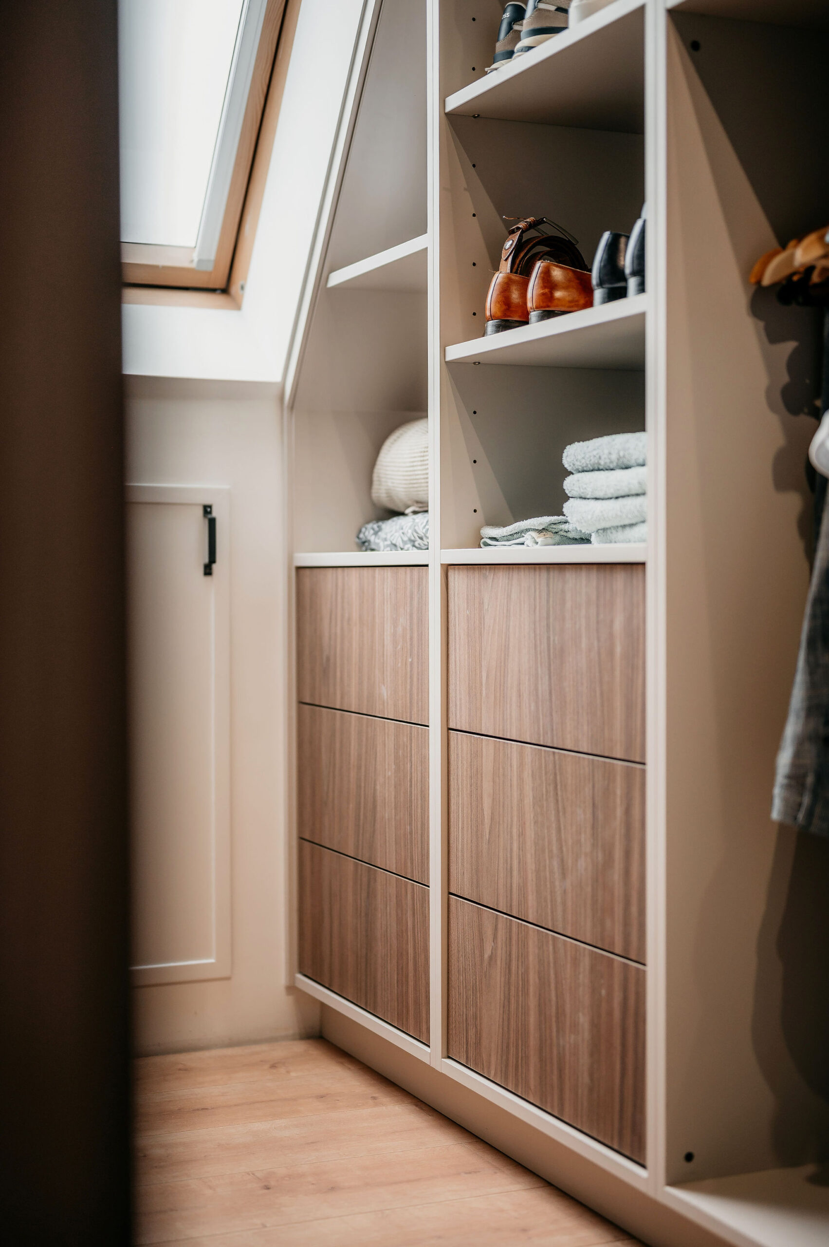 Voor deze woning in Meteren verzorgde Tornebold Interieurs het maatwerk voor zowel de slaapkamer als de gang. Alles is uitgevoerd in dezelfde rustige stijl, waardoor het hele huis één geheel vormt. De lichte tinten, donkere houtaccenten en verfijnde details brengen warmte en strakheid in huis.