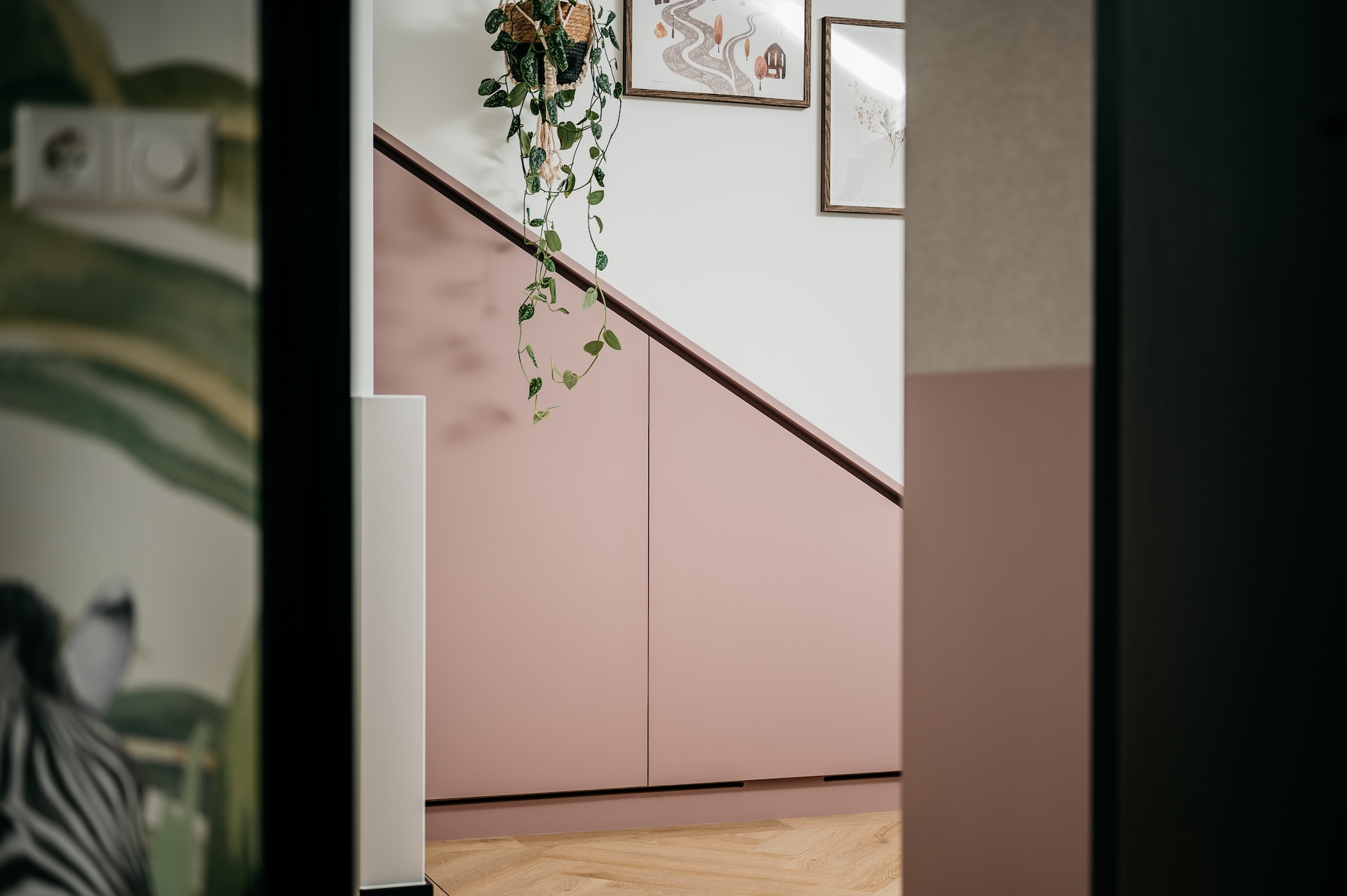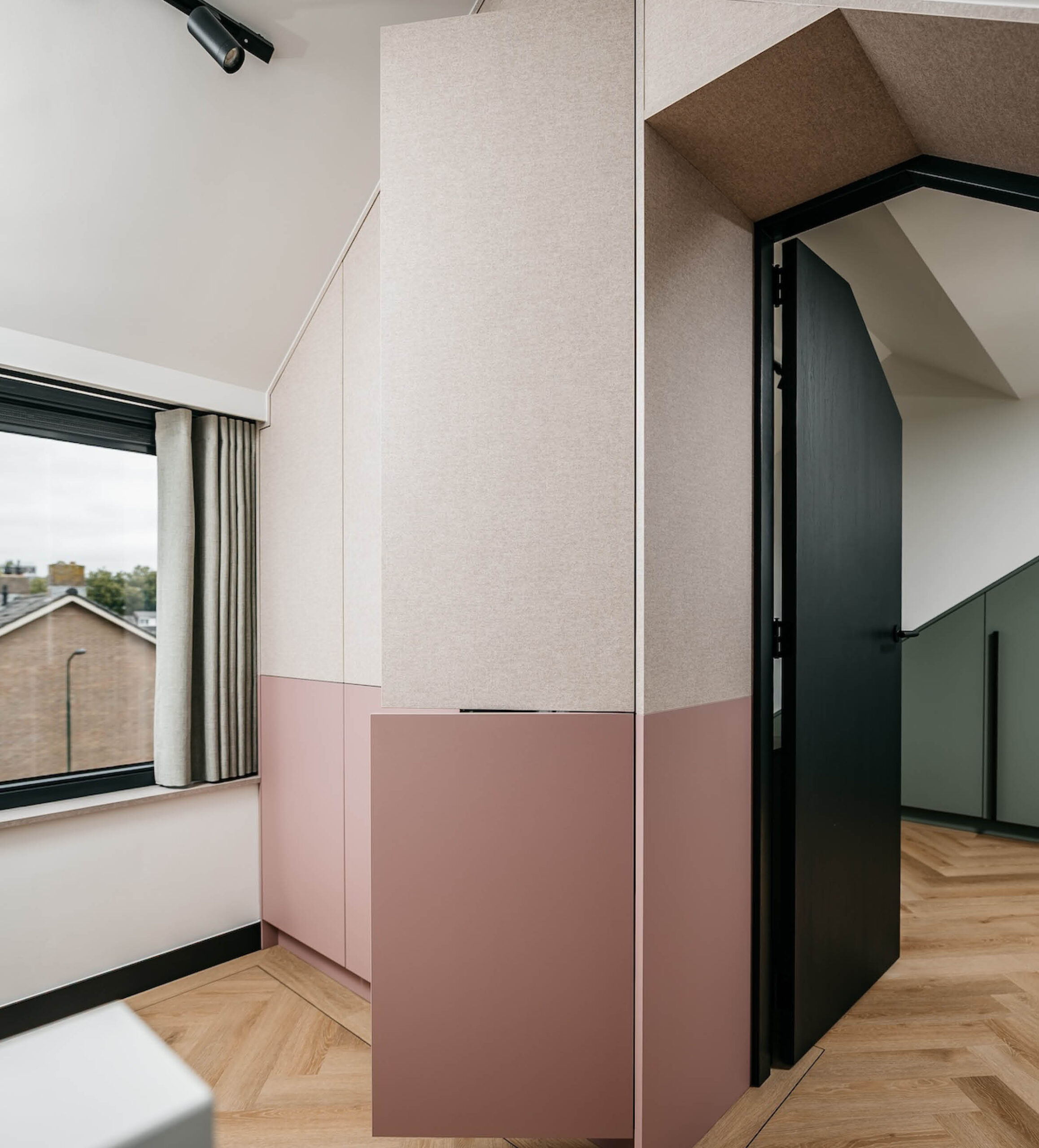 Een slaapkamer met karakter. Tornebold Interieurs maakte dit maatwerkinterieur met oog voor detail. De kast onder de schuine wand biedt volop bergruimte en sluit naadloos aan bij het bed. Donkere houtaccenten, zachte kleuren en speelse elementen zoals bamboe zorgen samen voor een warme, natuurlijke sfeer waarin alles klopt. Daarbij hebben we op de overloop een roze maatwerkkast mogen maken. Prachtig passend bij de stijl van de woning.