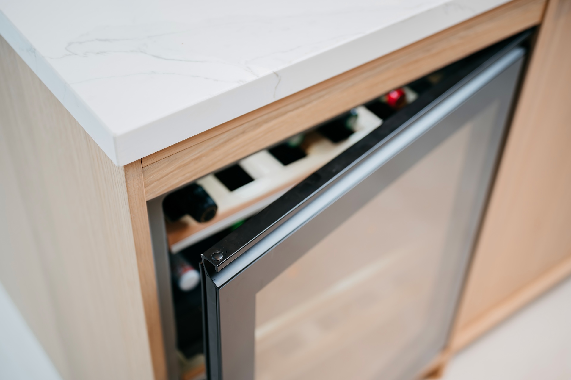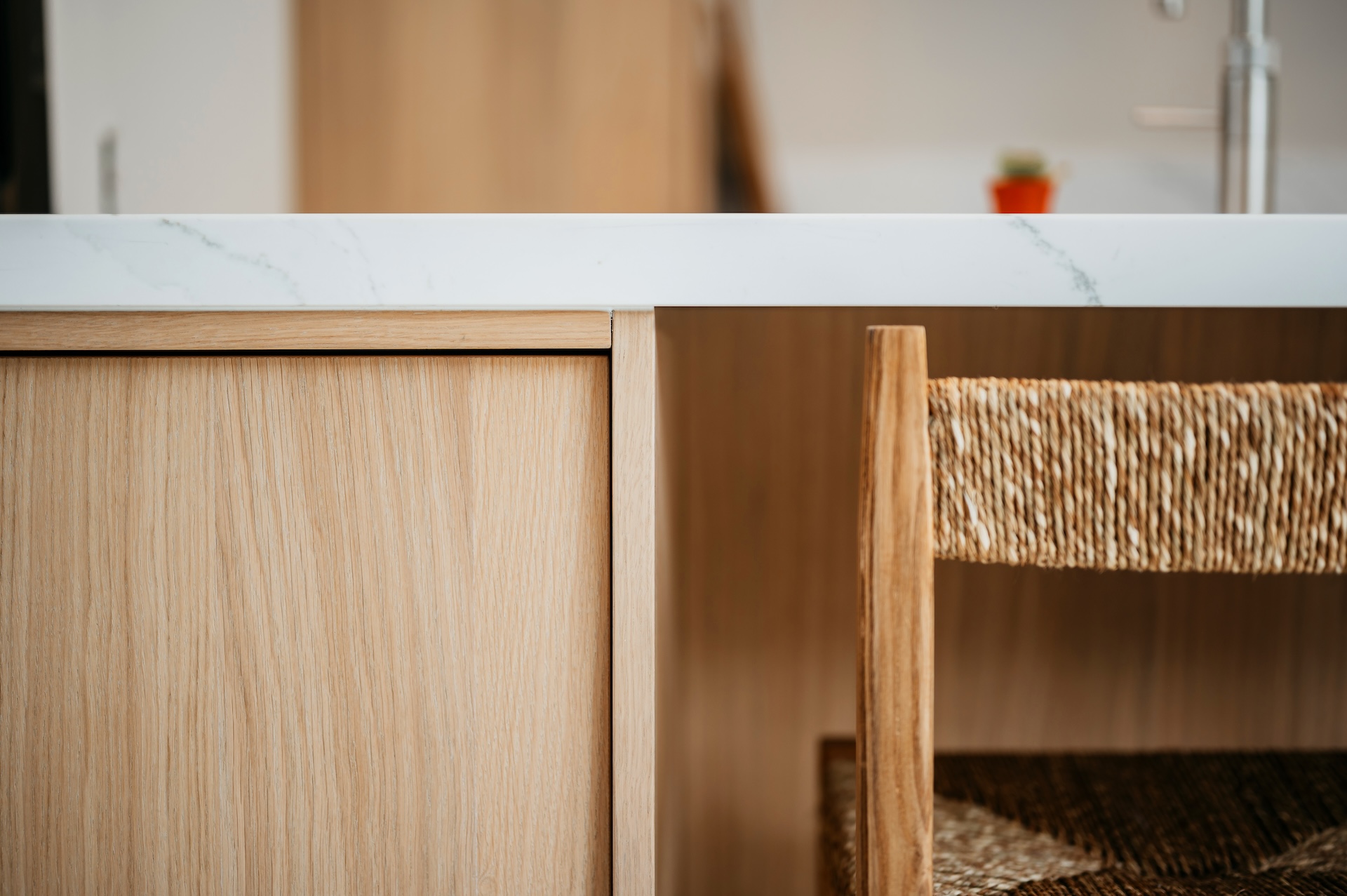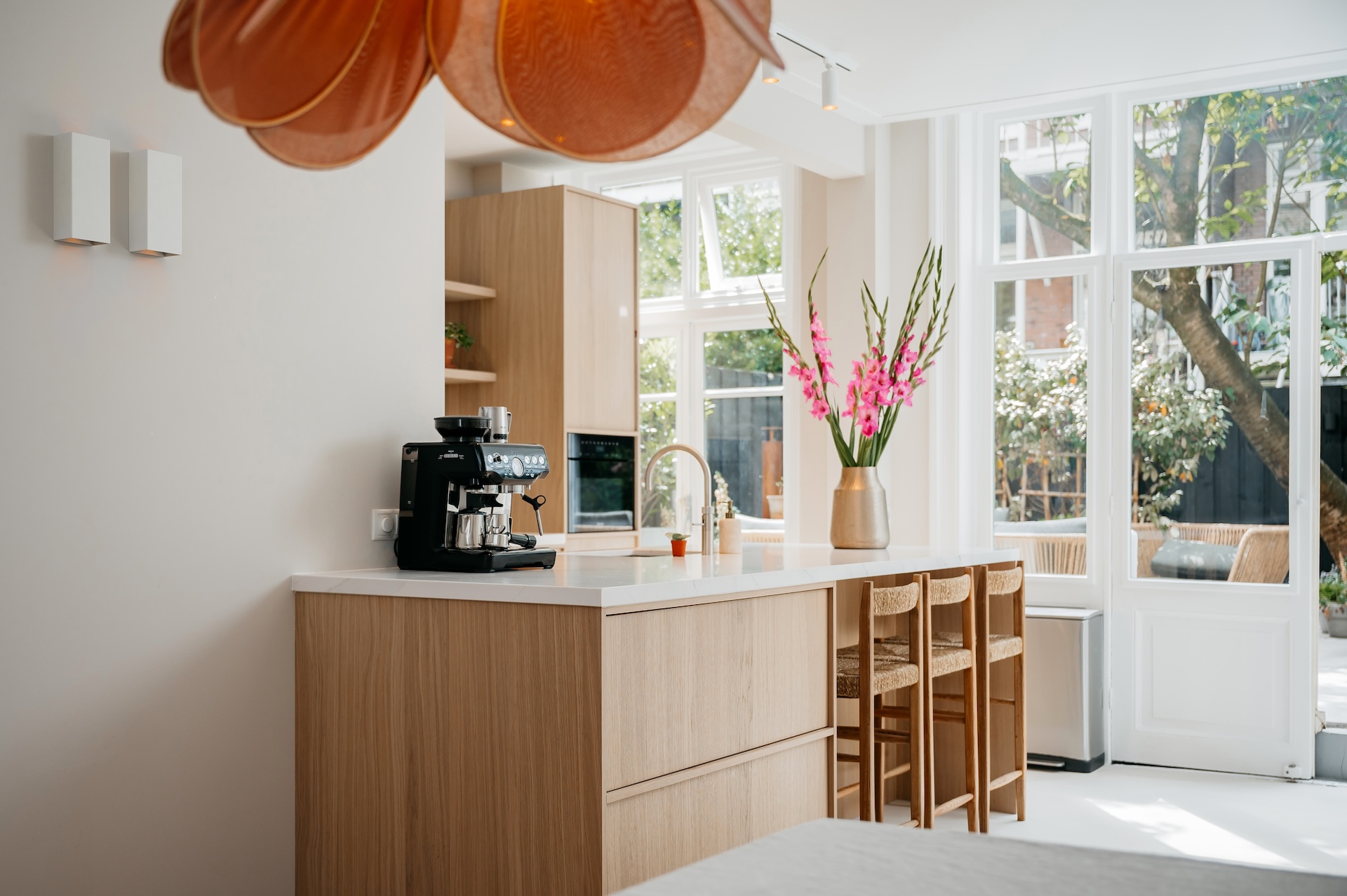 Voor een woning in Amsterdam realiseerde Tornebold Interieurs deze lichte, rustige keuken. Het eikenhout zorgt voor warmte, het witte blad en de grote ramen voor lucht en licht. Een praktische indeling, fijne materialen en oog voor detail maken het een plek waar koken en wonen mooi samenkomen.